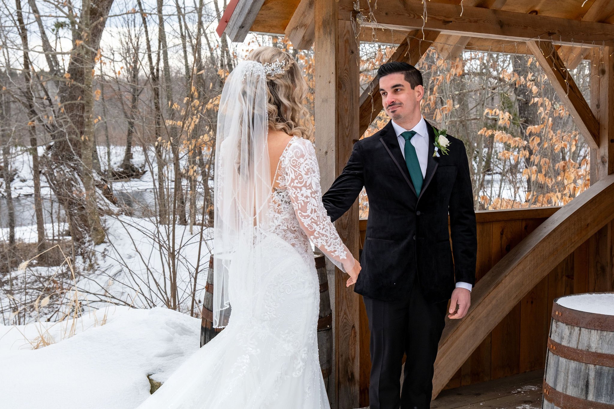 The day began with both Alyssa and Justin preparing at The Old Saco Inn, renowned for its rustic charm and picturesque snowy landscapes. Alyssa was radiant as she got ready in the bridal suite of the barn, her preparation space bathed in natural light reflecting off the snow outside. Justin prepared in the Lexington room and the pub area, his pre-ceremony moments infused with anticipation.