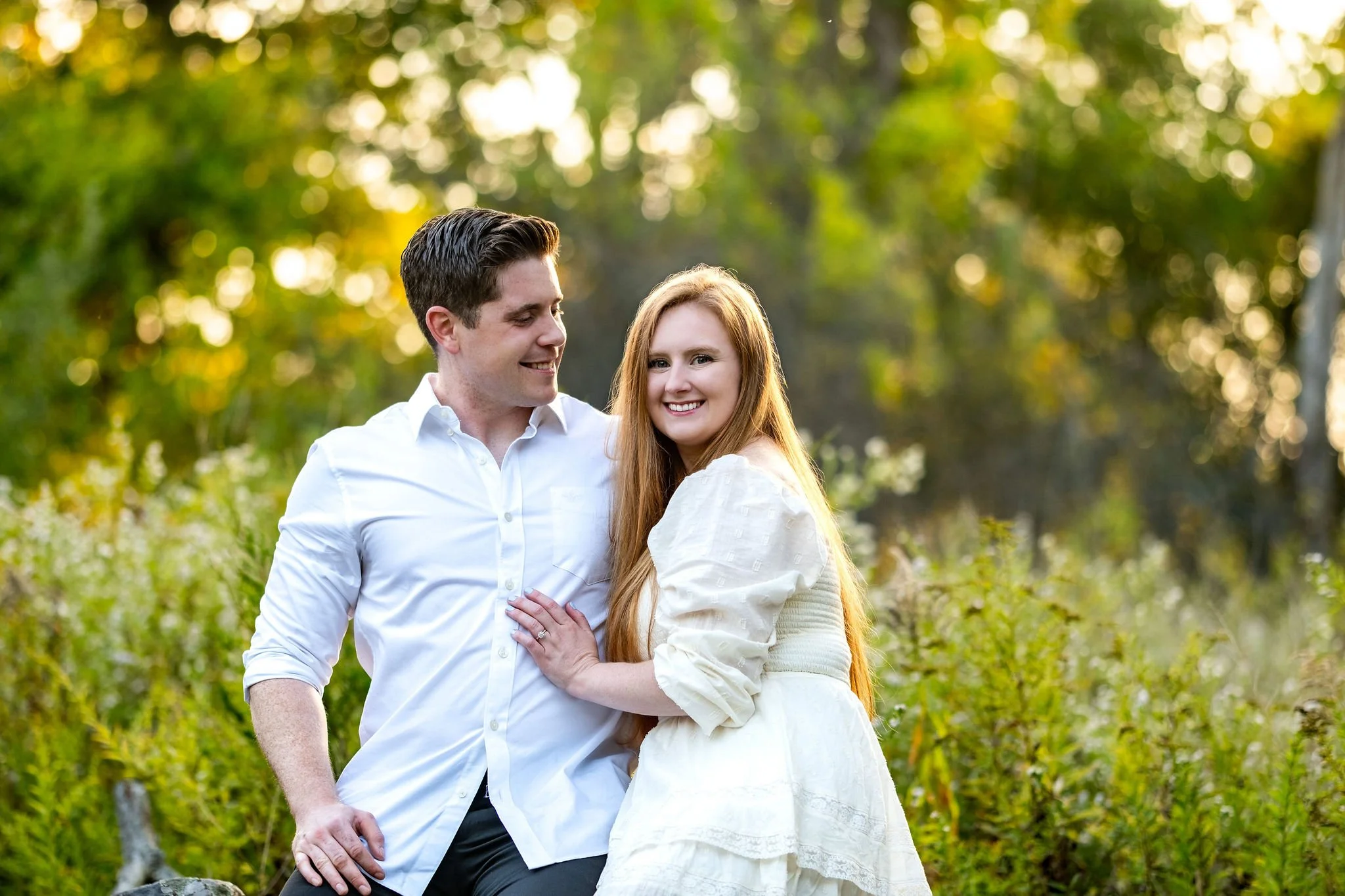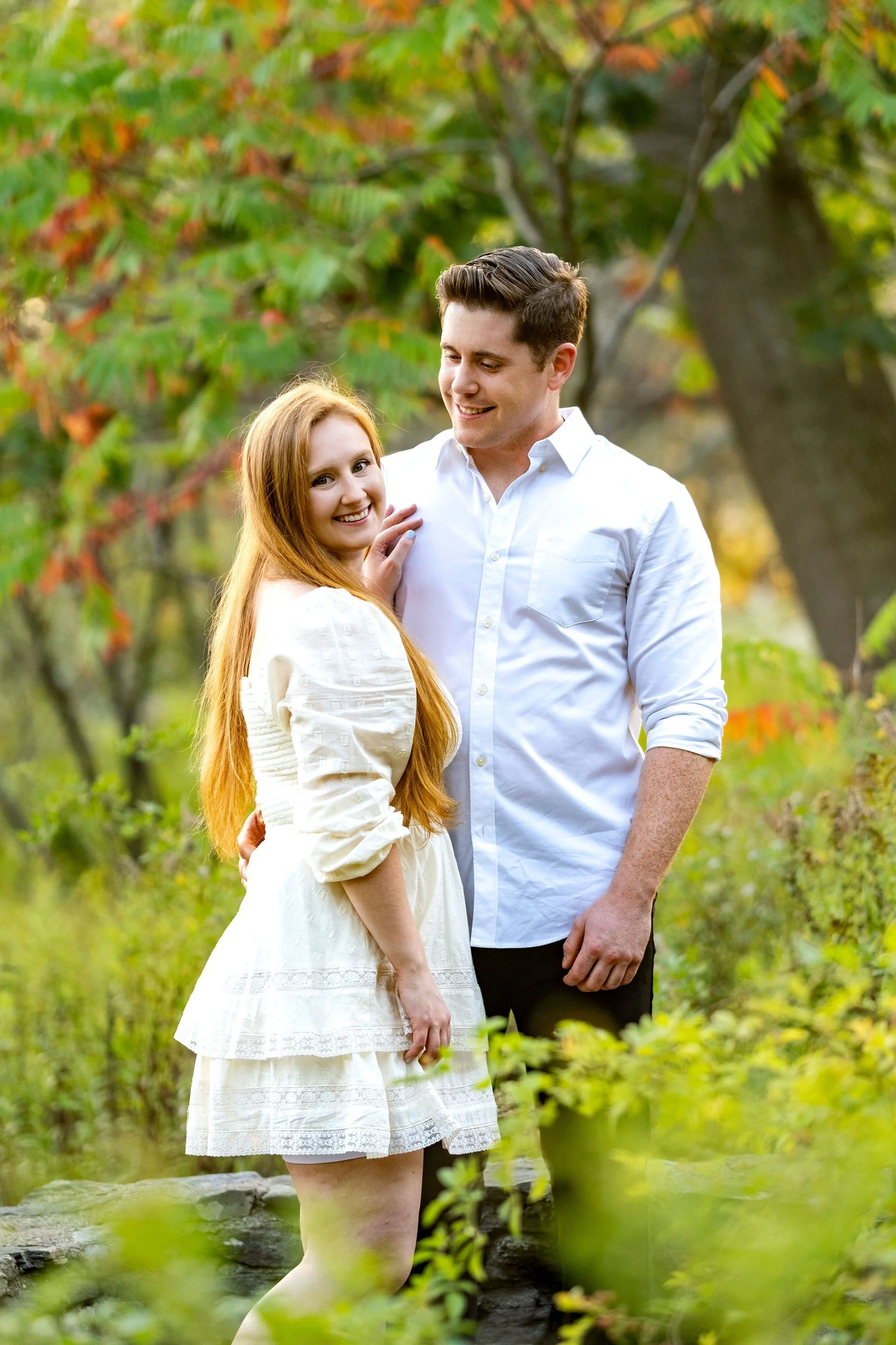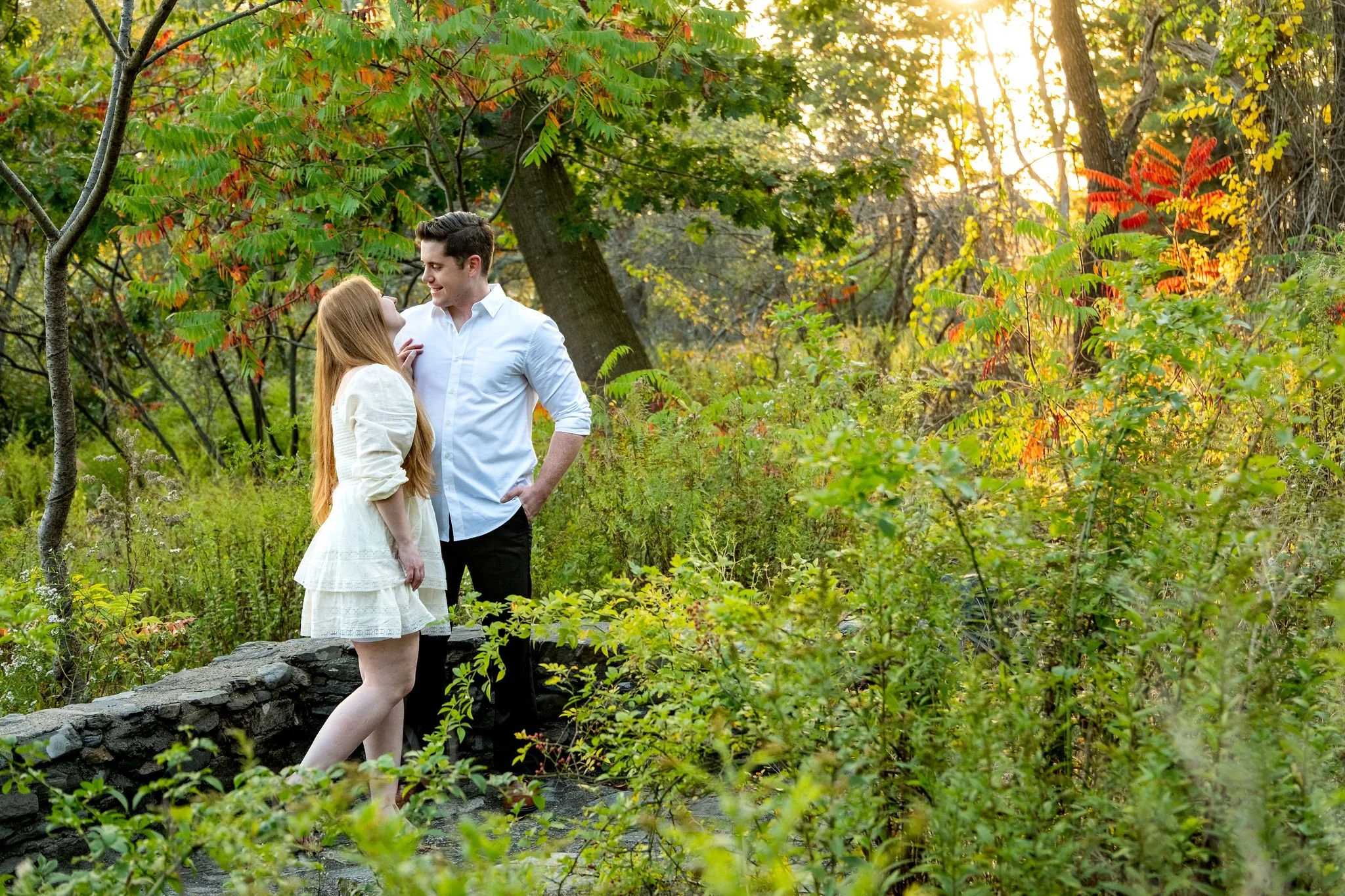 We started our time wandering through the park’s wooded trails, where the late-afternoon sun filtered through the leaves, wrapping them in a warm glow. Kayla’s flowy white dress and Ethan’s classic look paired beautifully with the natural greenery, creating timeless portraits among the stone walls and winding paths.