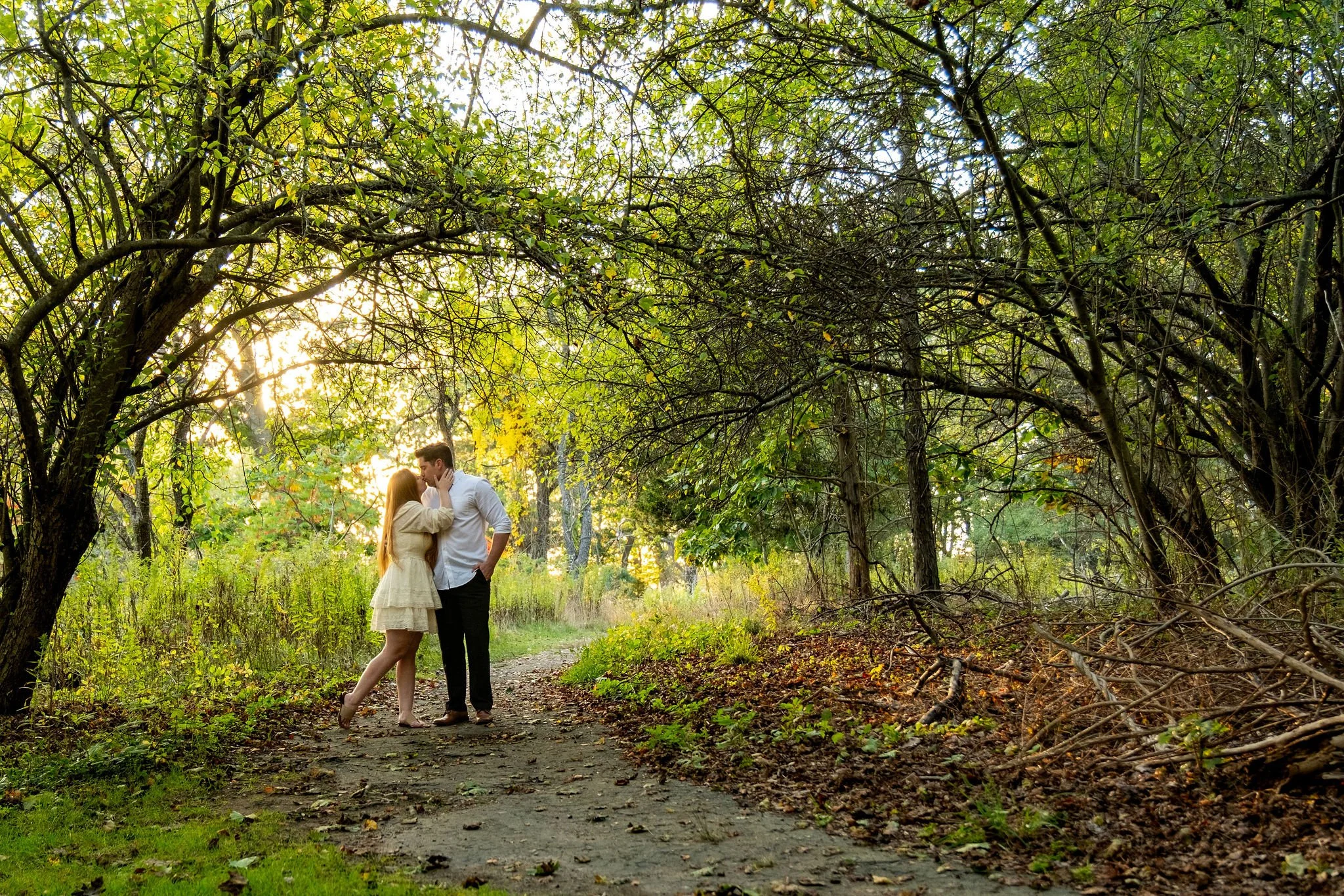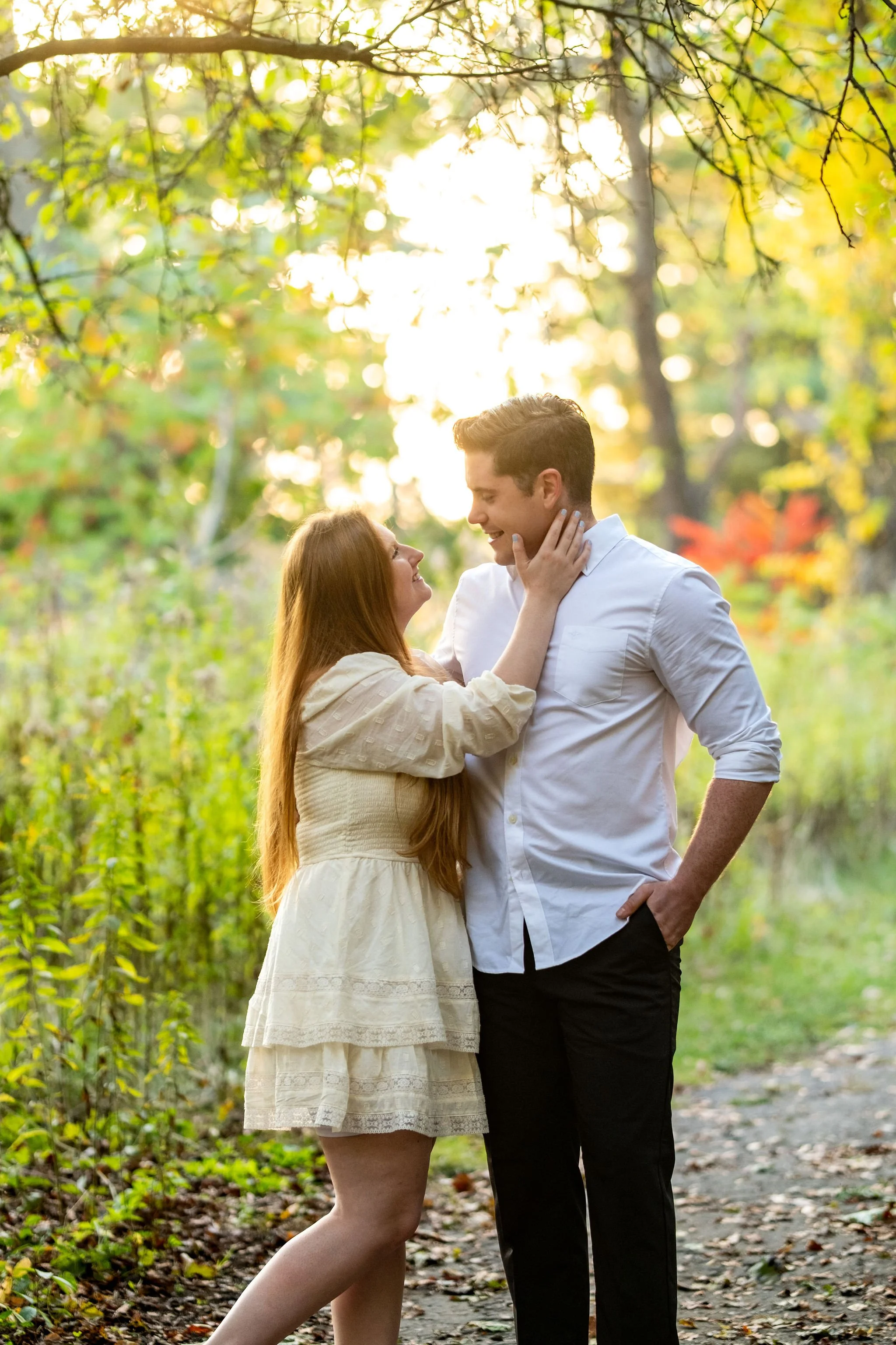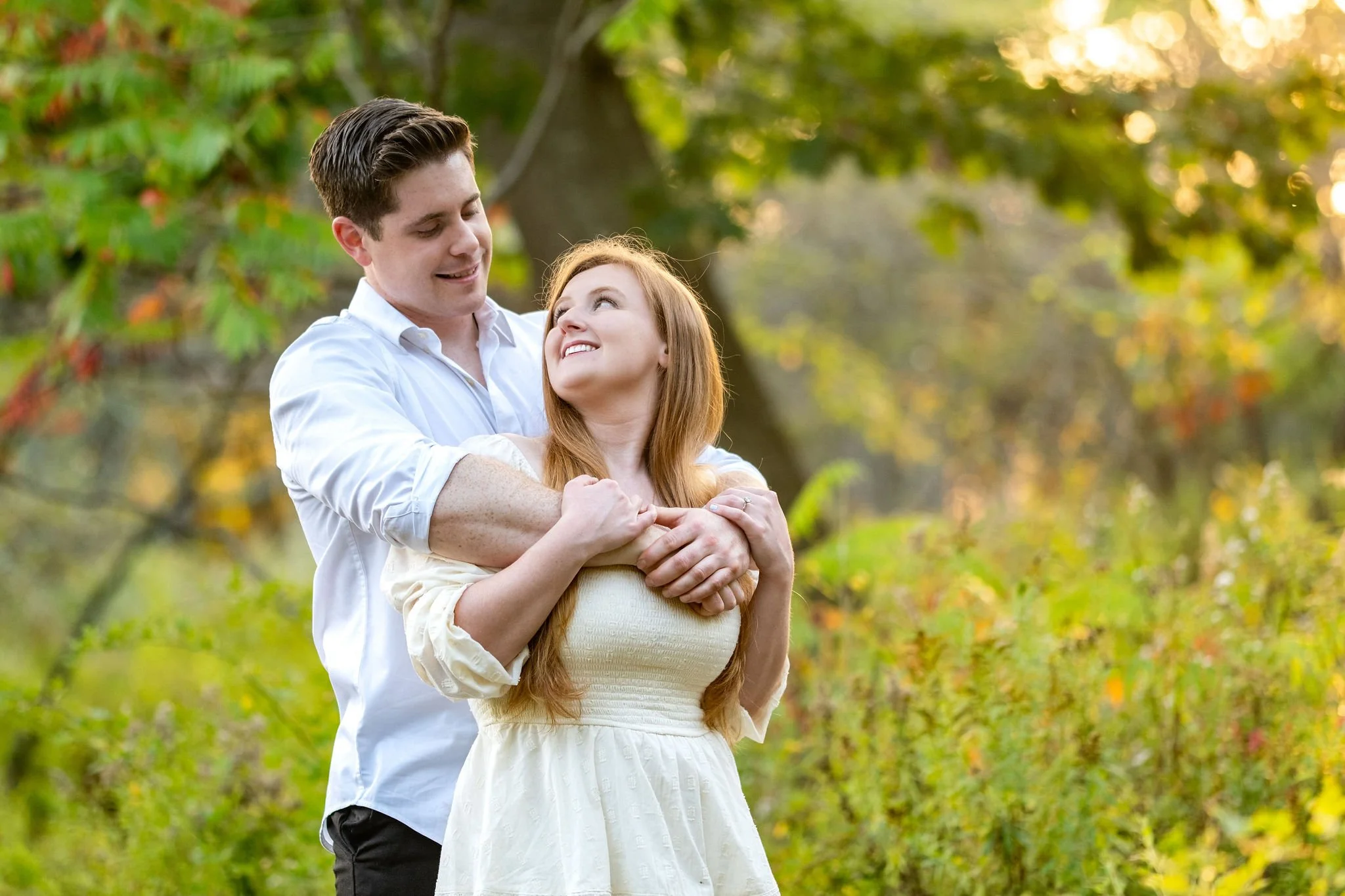 We started our time wandering through the park’s wooded trails, where the late-afternoon sun filtered through the leaves, wrapping them in a warm glow. Kayla’s flowy white dress and Ethan’s classic look paired beautifully with the natural greenery, creating timeless portraits among the stone walls and winding paths.
