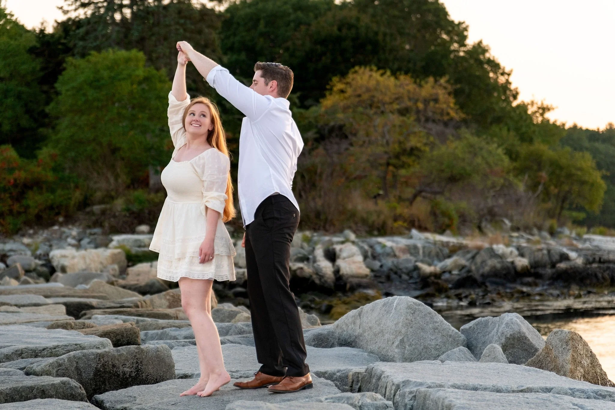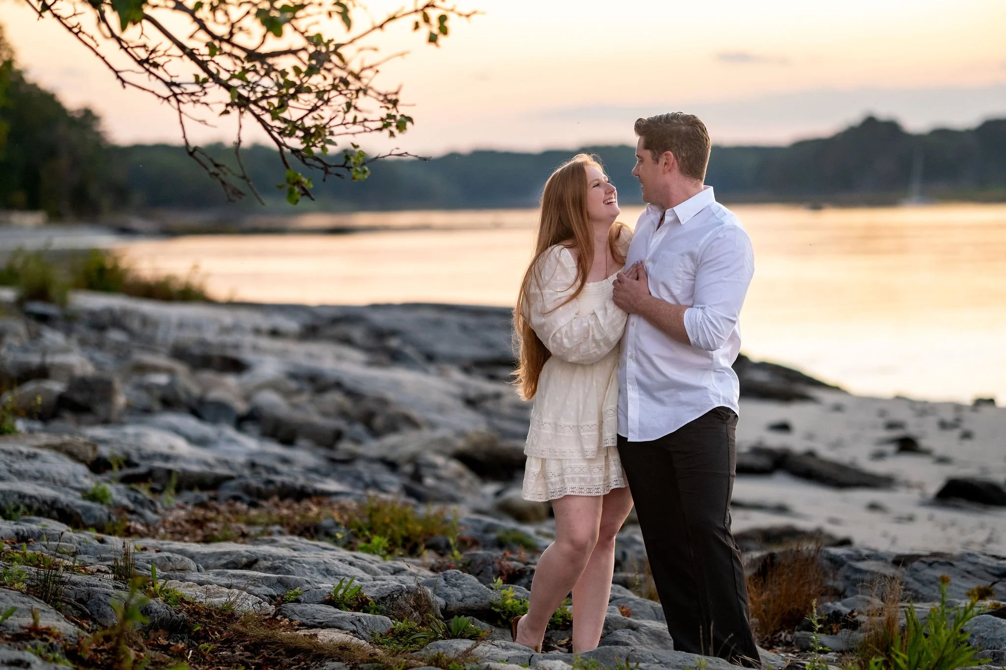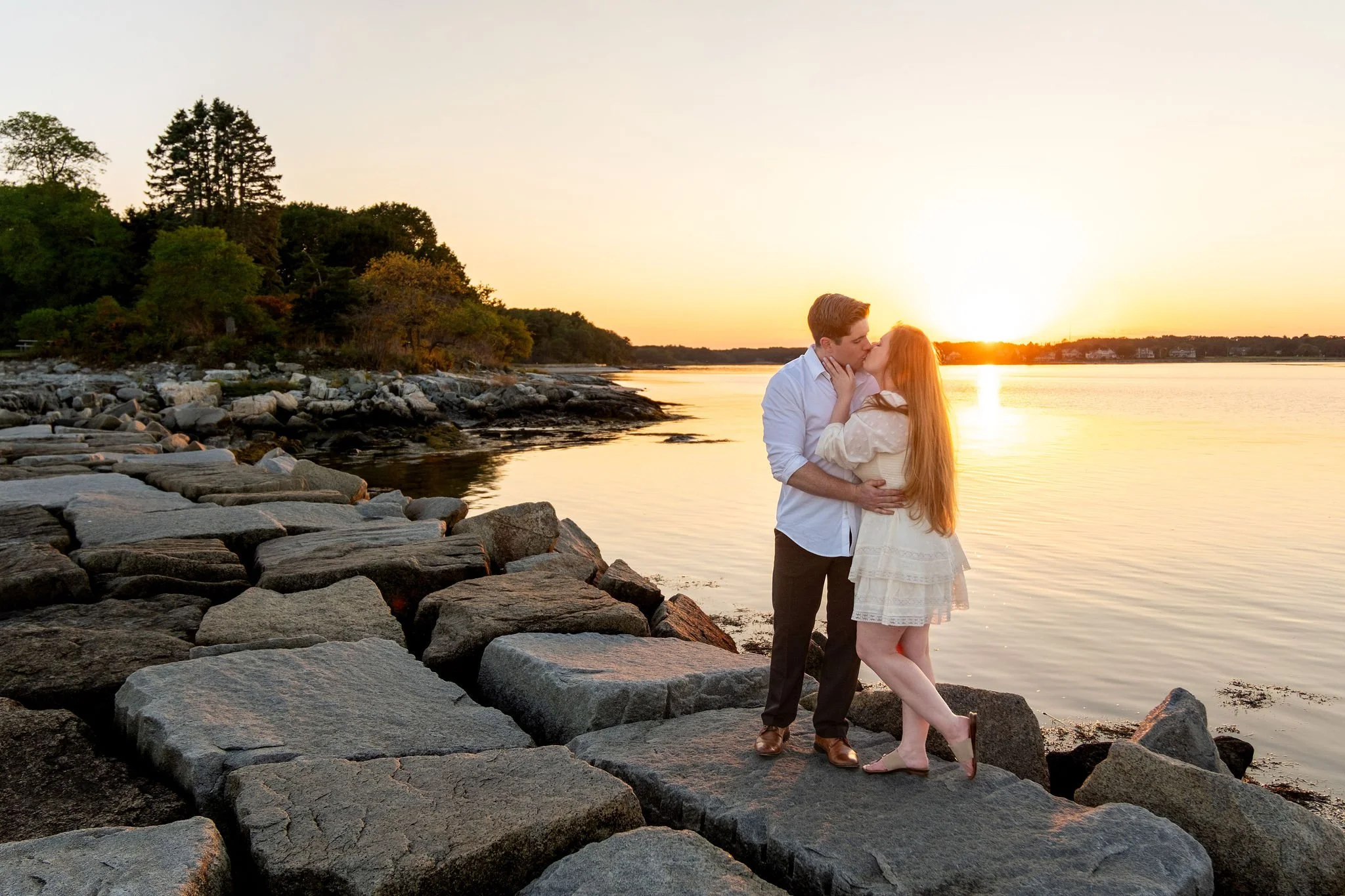 On a warm September evening, the shoreline of Rye, New Hampshire was bathed in golden light as Kayla and Ethan celebrated their engagement with a session at Odiorne Point State Park. The combination of rugged rocky coastline, soft sandy stretches, and tree-lined paths gave us the perfect variety of backdrops to capture their love story.